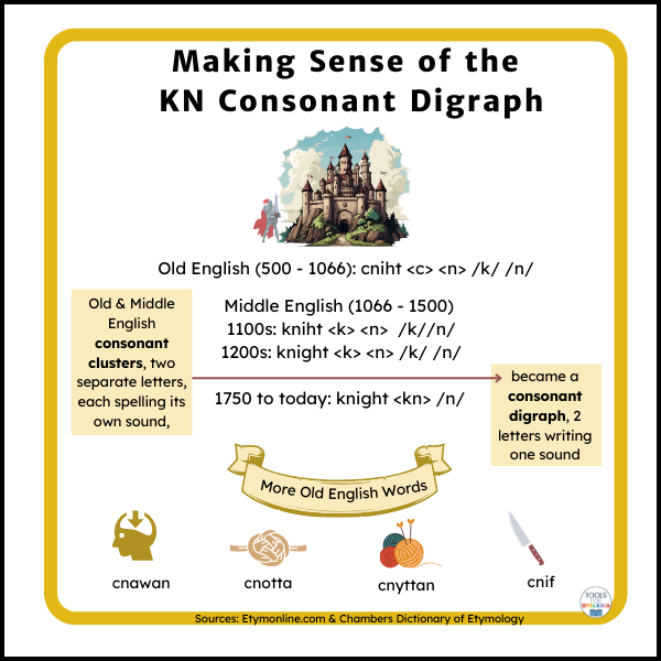 There’s no trick to sound out when it’s <n> and when it’s <kn>.  With the resource you’re about to download, your students will see where this digraph came from. Then they’ll read, spell, and write and have fun too. They’ll make sense of the KN consonant digraph and it will become familiar to them.